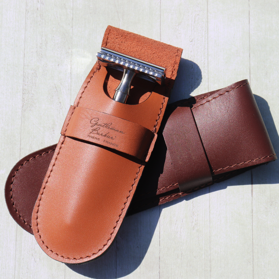 Etui pour rasoir en cuir couleur camel